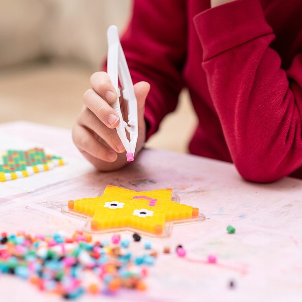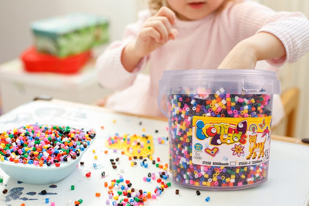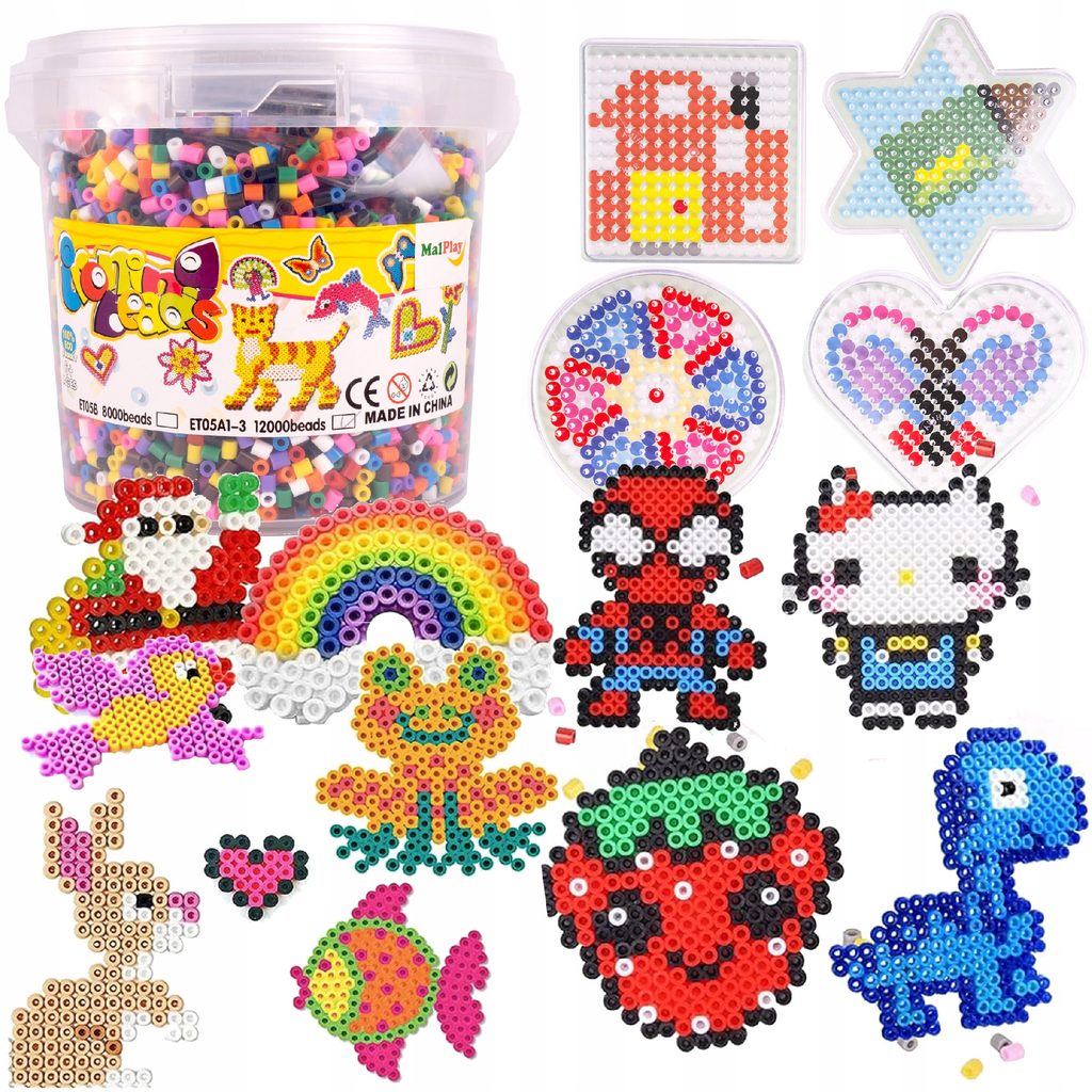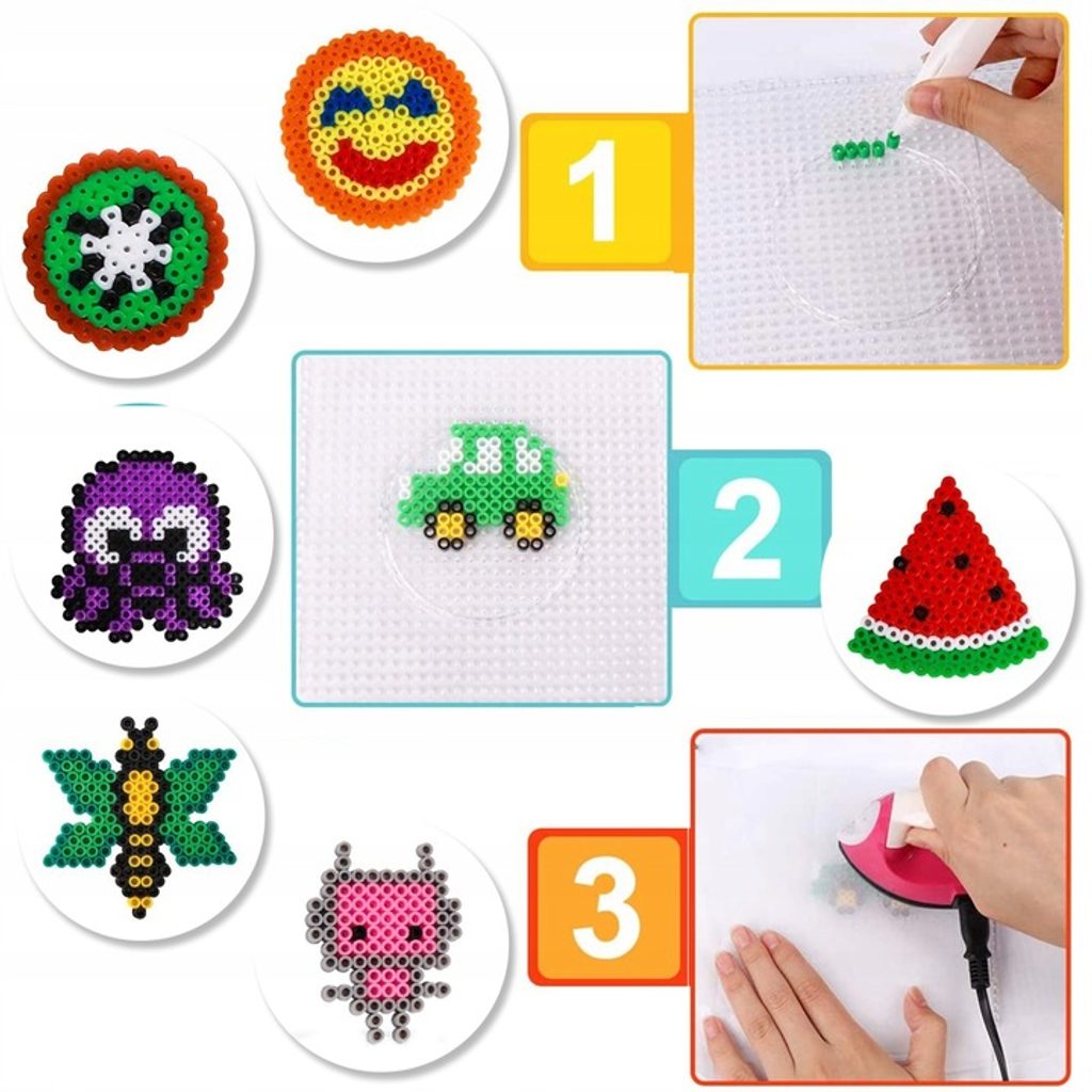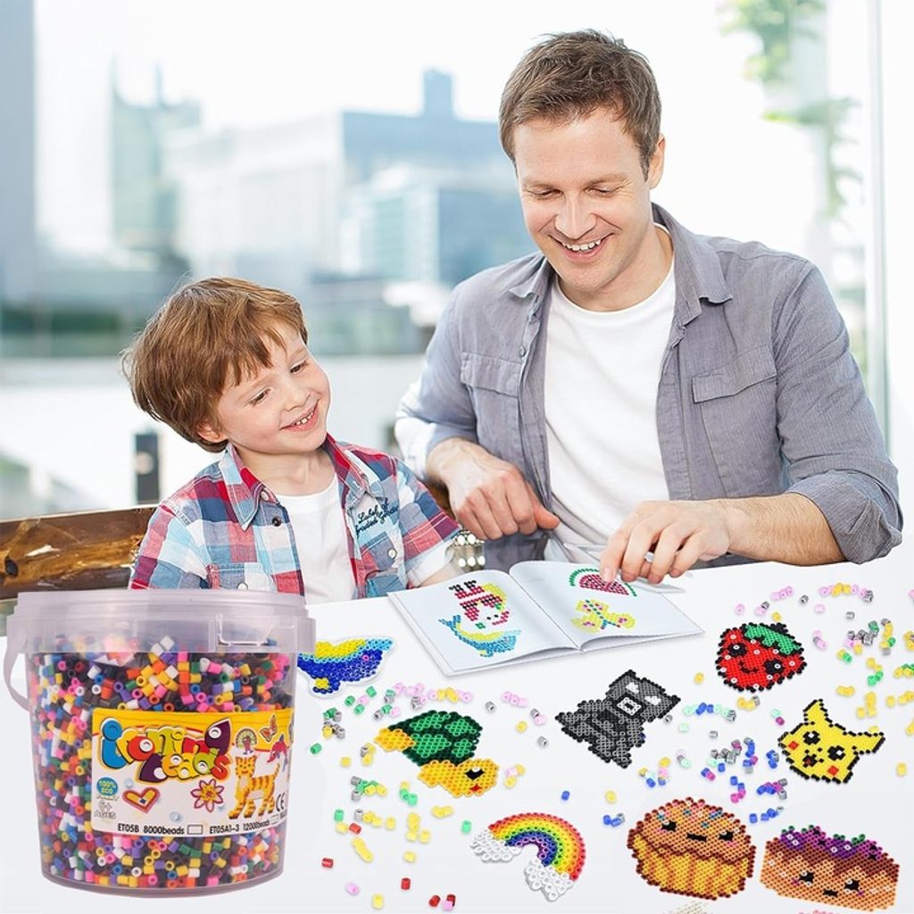 Sada barevných zažehlovacích korálků v kyblíčku Iron Beads učí dětí představivost, podporuje kreativitu a manuální dovednosti. Sada obsahuje celkem 12000 ks korálků v 10 barevných odstínech. Lze z nich vytvářet různé vzory, tvary, náramky a náhrdelníky, které se potom zažehlí přes přiložený žehlící papír. Vše je uloženo v praktickém plastovém kyblíčku s horním úchytem. Hračka je určena pro děti od 6 let věku.
